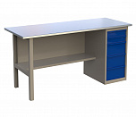 Стол бестумбовый поставляется в разобранном виде (4 места). Нагрузка на столешницу до 600 кг. Стандартный цвет: корпус - серый глянец RAL 7030, ящики и двери тумб - синий RAL 5017. Размеры: 855х1200х700мм. Вес: 40 кг.