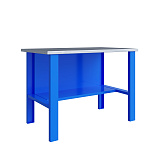 Верстак комплектуется полкой-стенкой, расположенной под столешницей для удобного размещения габаритного инструмента и оснастки. Опорные элементы выполнены сварными из холоднокатаной стали. Все металлические элементы покрыты полиэфирной порошковой краской. Столешница из фанеры толщиной 24 мм, которая покрыта листом оцинкованной стали толщиной 1,2 мм. Глубина столешниц 696 мм. Максимальная масса груза на столешнице - 350 кг.