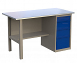 Верстак однотумбовый поставляется в разобранном виде. Нагрузка на столешницу до 600 кг. Стандартный цвет: корпус - серый глянец RAL 7030, ящики и двери тумб - синий RAL 5017. Размеры:855x1400x700 мм. Вес: 86 кг.