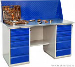 Двухтумбовый. Допустимая нагрузка на столешницу 1000 кг. Опорные элементы выполнены сварными из холоднокатаной стали. Для выполнения сборочных, ремонтных, слесарных, монтажных и других видов работ на производстве, в сервисных центрах, мастерских, гаражах, а также для обучения технологии в учебных заведениях. Комплектуется полкой-стенкой, расположенной под столешницей для удобного размещения габаритного инструмента и оснастки. Размеры верстака: 855x1596x696 мм. Вес: 122 кг. Поставляется в 4 комплектациях на выбор.