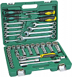Набор 47 предметов включает: головки 1/4", головки с насадкой SL 1/4", головки с насадкой PH 1/4", головка с насадкой HEX 1/4", ключи шестигранные, трещотка 1/4", удлинители, вороток с плавающей головкой 1/4", карданный переходник 1/4", вороток 1/4".
