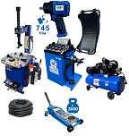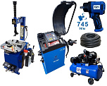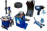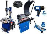 Комплект: шиномонтажный станок TS-21 для дисков: внешний 11÷20” + пистолет с манометром для подкачки шин + монтажка + пластиковые накладки на зажимные кулачки + регулятор давления с влагоотделителем и манометром. + TS-500 балансировочный станок с автозапуском, для колес легковых автомобилей и легких грузовиков, диаметр диска с резиной до 760 мм. размеры диска: ширина 3"–9” (76-228 мм), диаметр диска  10"–21” (254-533 мм). + кожух защитный + клещи + кронциркуль + быстрозажимная гайка + набор конусов + подкатной домкрат г/п 3,0т. 130-465мм. + ударный пневмогайковерт 1/2" крутящий момент 745Нм +  шланг кислородный 9мм 20Атм. 10м