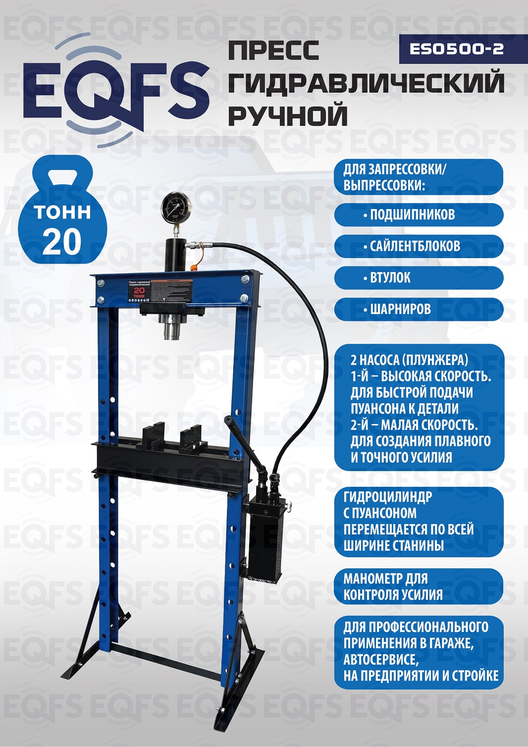· Пресс укомплектован гидравлическим ручным насосом с максимальным усилием 20т.