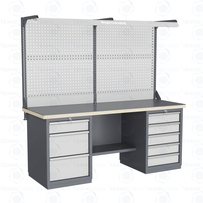 Двухтумбовый. Для выполнения тяжелых сборочных, слесарных и других видов работ на производстве, для установки в закрытых помещениях. Допустимая нагрузка на столешницу 3000 кг. Тумбы и опоры верстаков выполнены из профилированной холоднокатаной стали и имеют сварную конструкцию. На тумбы с выдвижными ящиками установлена система антиопрокидывания. В ящиках качественные усиленные шариковые направляющие полного выдвижения. Верстак покрыт ударопрочной и износостойкой порошковой краской. Для комфортной работы стоя и сидя. Размеры: 870x1993x743 мм. Поставляется в 4 комплектациях на выбор.