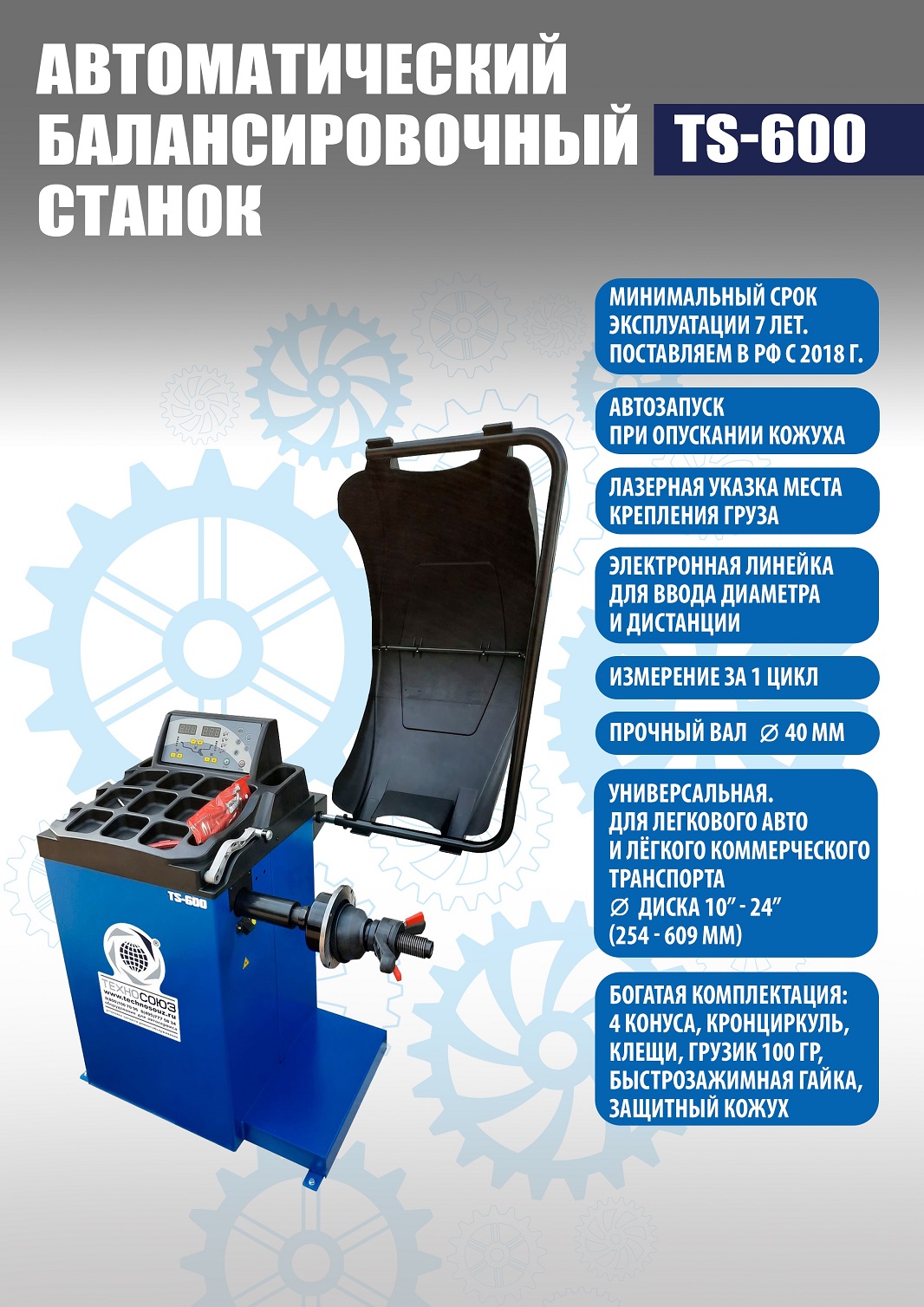 TS-600 Автоматический балансировочный станок. Автоматический ввод дистанции и диаметра диска. Остановка и фиксация колеса в месте установки грузика. Лазерная указка места установки грузика на 6 часов. Старт опусканием кожуха или с кнопки. Для колес легковых автомобилей, мотоциклов и легких грузовиков с диаметром диска с резиной до 800 мм. Размеры диска: ширина 3–10” (76-254 мм), диаметр диска 10–24” (254÷609 мм). Вал- 40мм. Гарантия 18 мес – наш монтаж, 12 мес – самостоятельная установка.