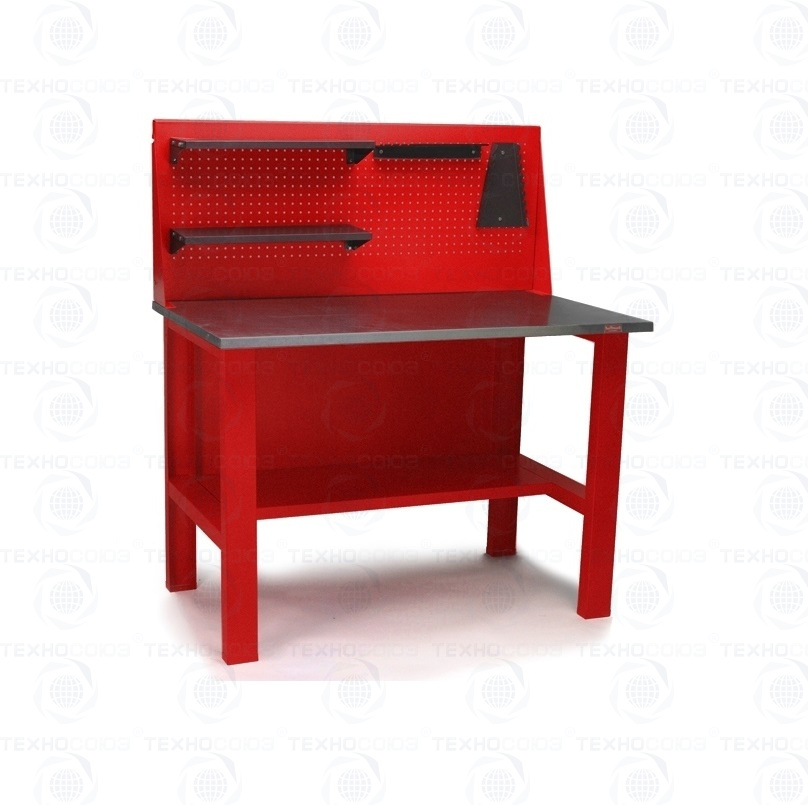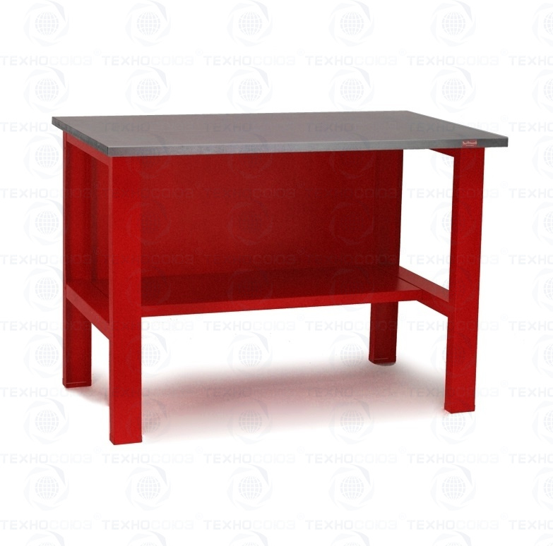Столешница полностью фанерная и сверху покрыта слоем оцинкованного металла в 1 мм. Толщина фанеры составляет 24 мм. Столешница монтируется на опоры, произведенные из листового металла. Слесарный стол имеет максимально простую конструкцию, включающую одну нижнюю полку, столешницу и 4 опоры. Представленная модель изделия не имеет перфорированного экрана.