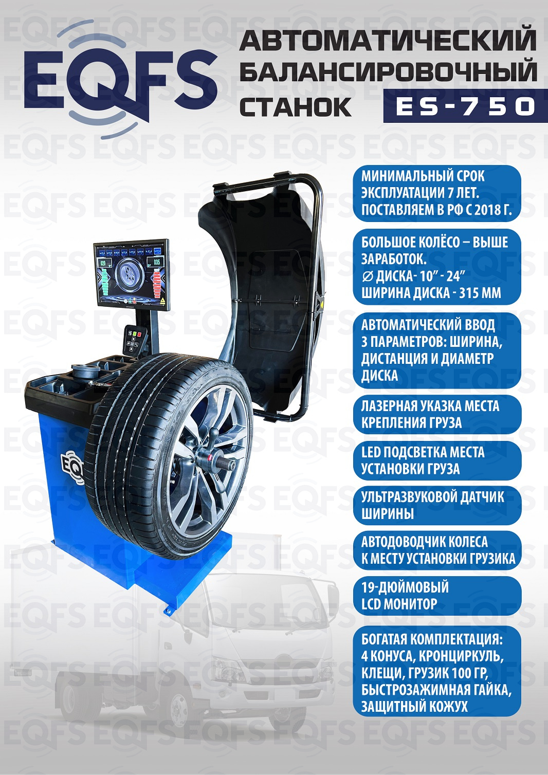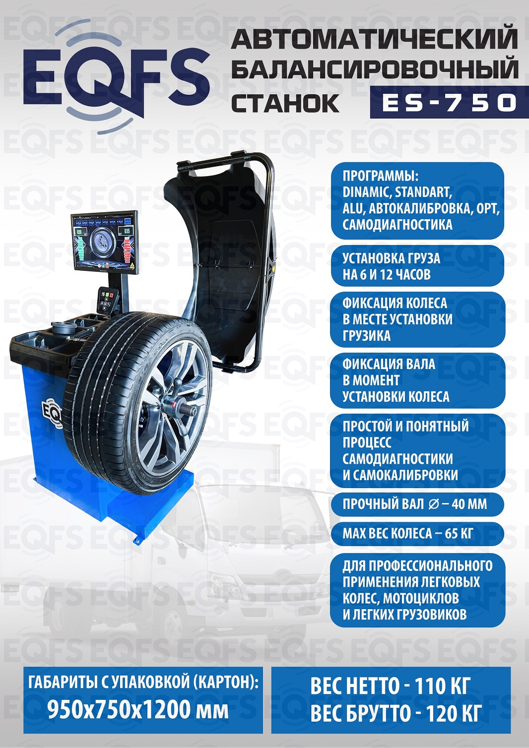 ES-750 Автоматический балансировочный станок. Ввод 3-х параметров ( диаметра диска, дистанции и ширины диска), 19-дюймовый LCD монитор с высококачественной 3D-графикой, ультразвуковой датчик ширины. Статическая и динамическая балансировка, ALU-программы для алюминиевых дисков. Программа OPT. Программа разделения и скрытой установки грузиков за спицами SPLIT. Режимы калибровки и самодиагностики. Для балансировки колёс легковых автомобилей, мотоциклов и лёгких грузовиков с диаметром колеса до 800 мм. Размеры диска: ширина 3–10” (76-254 мм) , диаметр диска 10–24” (254÷609 мм). Прочный вал Ø - 40мм. Вес колеса 65 кг. Гарантия 18 мес – наш монтаж, 12 мес – самостоятельная установка.