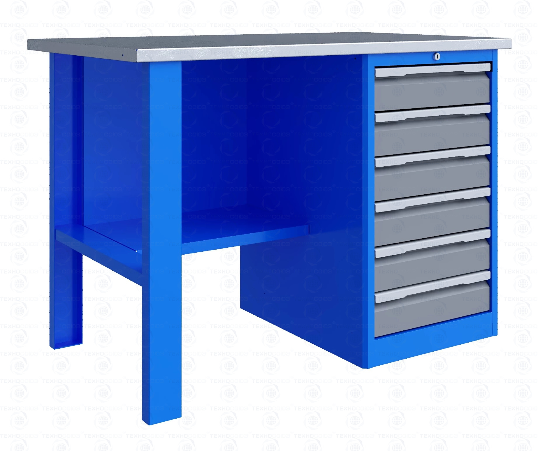 Однотумбовый. Допустимая нагрузка на столешницу 750 кг. Опорные элементы выполнены сварными из холоднокатаной стали. Верстак состоит из столешницы,  опоры, тумбы P6 с шестью малыми ящиками и полки-стенки. Все металлические элементы покрыты полиэфирной порошковой краской. Столешница из фанеры марки ФСФ толщиной 24 мм, которая покрыта лаком-антисептиком и листом оцинкованной холоднокатаной стали толщиной 1,2 мм. Размеры (ВхШхГ) 855x1196x696 мм.