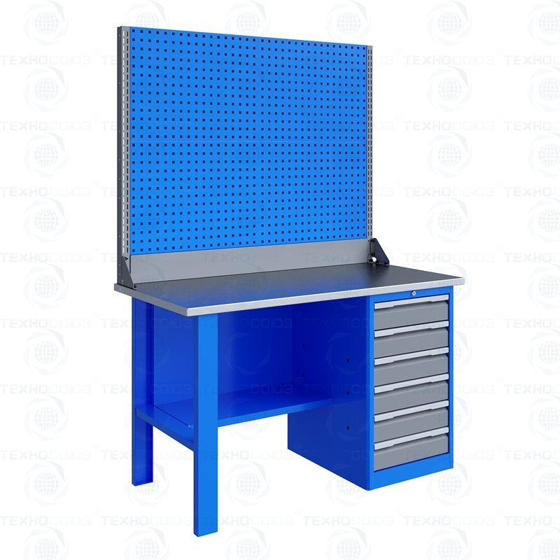Однотумбовый. Допустимая нагрузка на столешницу 750 кг. Опорные элементы выполнены сварными из холоднокатаной стали. Для выполнения сборочных, ремонтных, слесарных, монтажных и других видов работ на производстве, в сервисных центрах, мастерских, гаражах, а также для обучения технологии в учебных заведениях. Комплектуется полкой-стенкой, расположенной под столешницей для удобного размещения габаритного инструмента и оснастки. Размеры верстака: 855x1396x696 мм. Вес: 83 кг. Поставляется в 4 комплектациях на выбор.