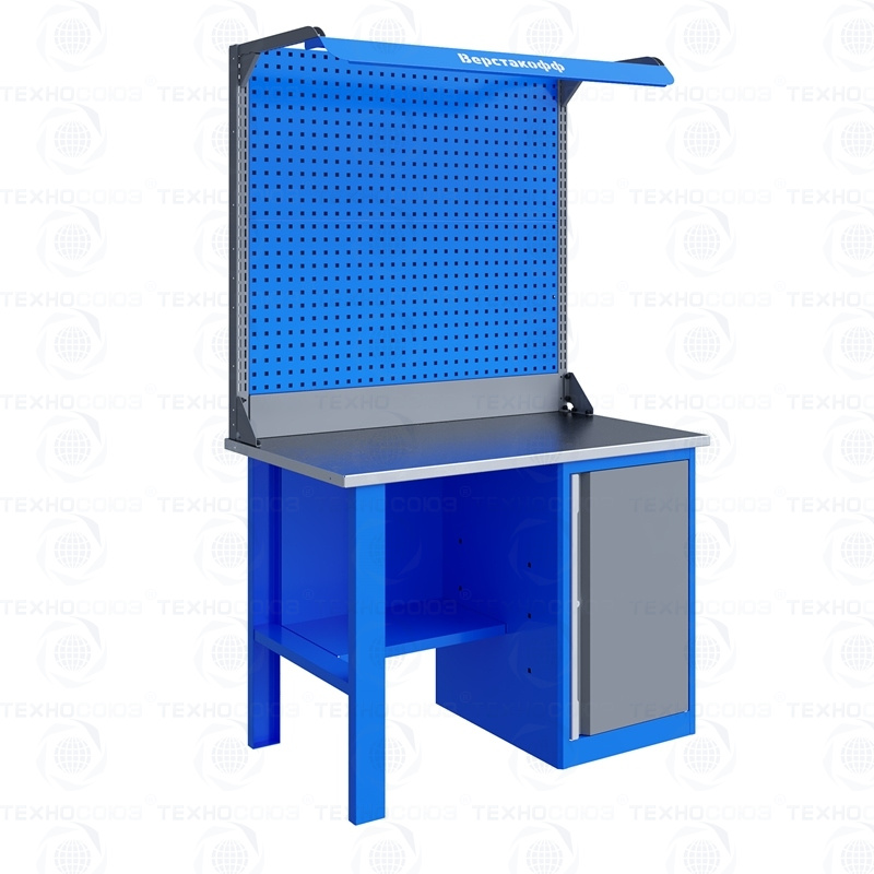 Однотумбовый. Допустимая нагрузка на столешницу 750 кг. Опорные элементы выполнены сварными из холоднокатаной стали. Для выполнения сборочных, ремонтных, слесарных, монтажных и других видов работ на производстве, в сервисных центрах, мастерских, гаражах, а также для обучения технологии в учебных заведениях. Комплектуется полкой-стенкой, расположенной под столешницей для удобного размещения габаритного инструмента и оснастки. Размеры верстака: 855x1396x696 мм. Вес: 60 кг. Поставляется в 4 комплектациях на выбор.
